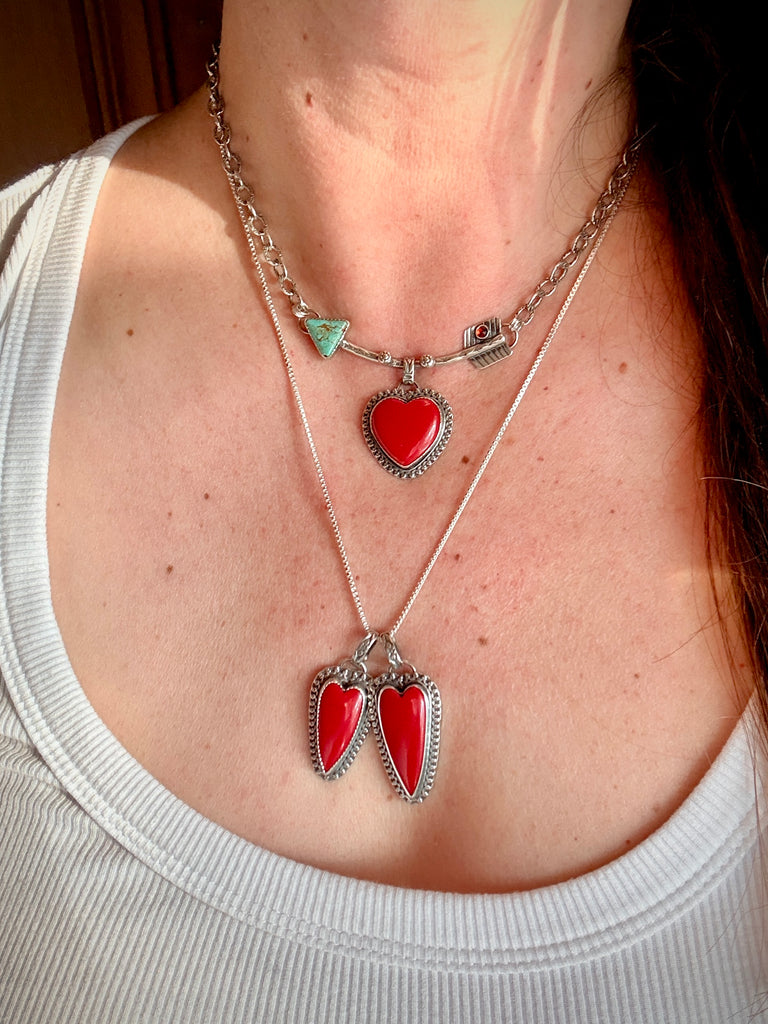 Hand fabricated Arrow necklace with Turquoise, Garnet and Rosarita Heart.