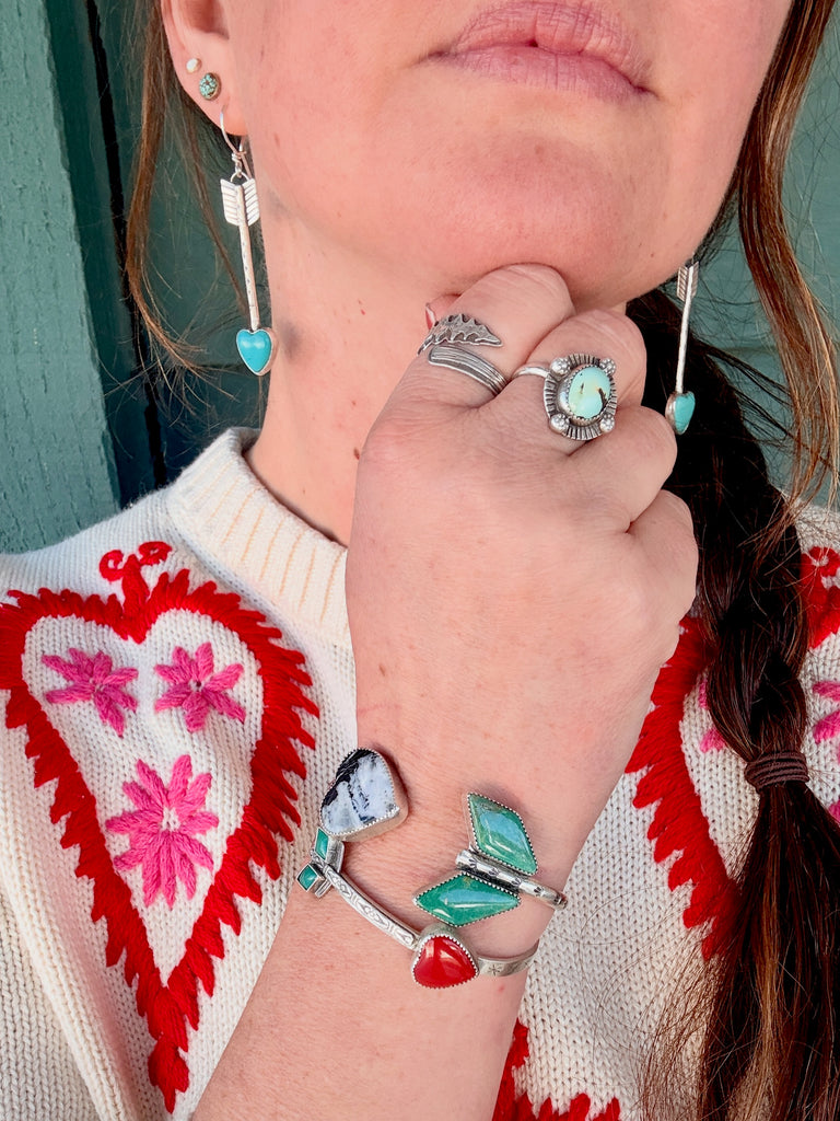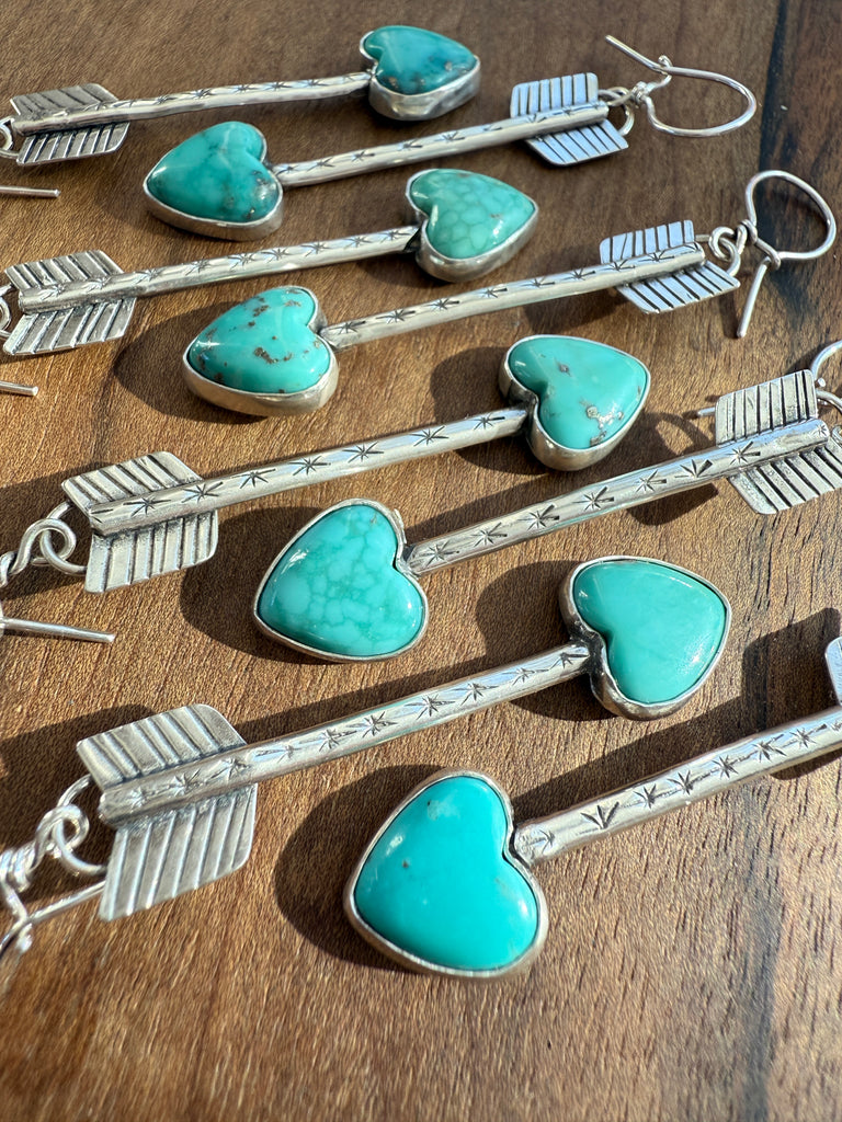 Hand fabricated Arrow earrings with Compitos turquoise hearts.