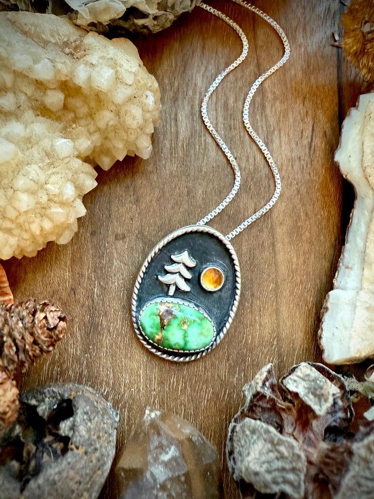 Shadowbox style pendant featuring Sonoran turquoise, rose cut citrine and pine tree.