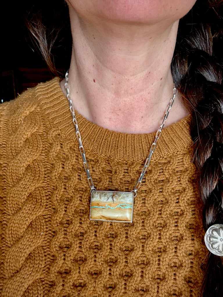 Statement necklace featuring high grade Royston ribbon turquoise and chunky chain.