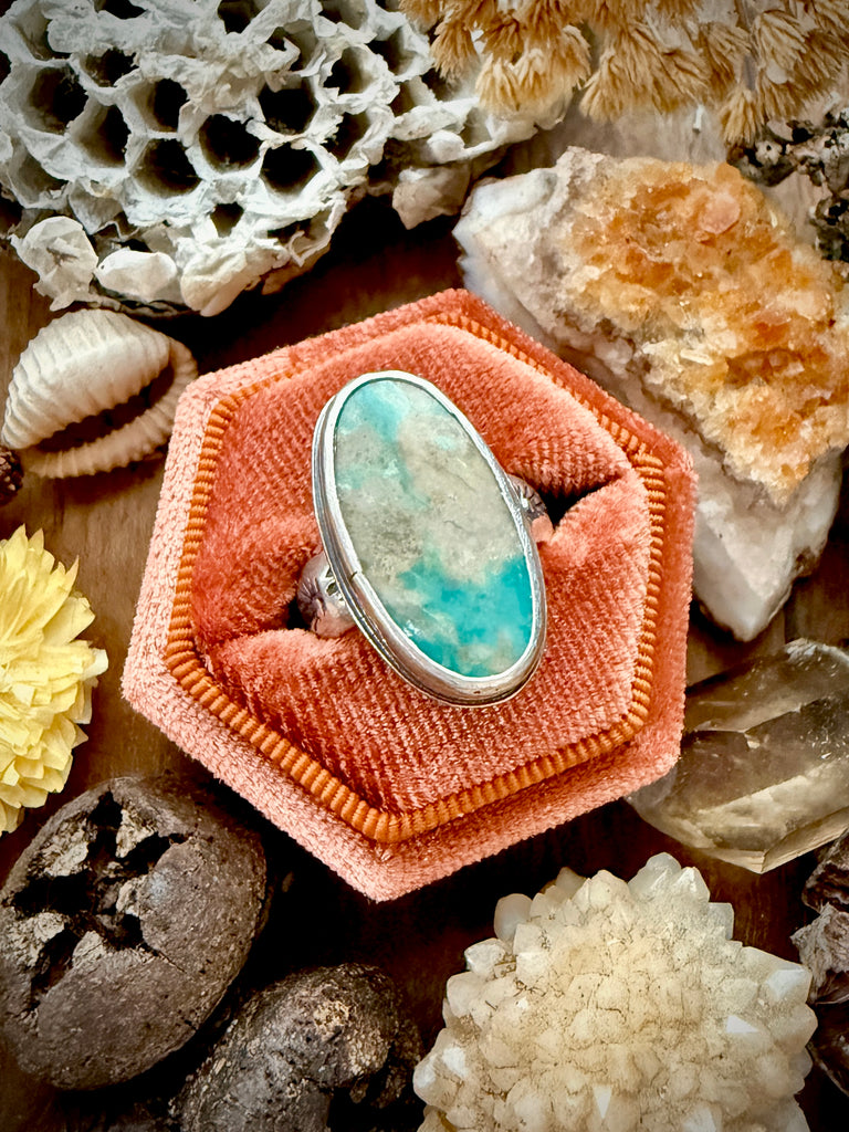 Large Royston turquoise stone sits atop a hand stamped sterling band.