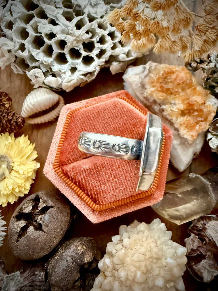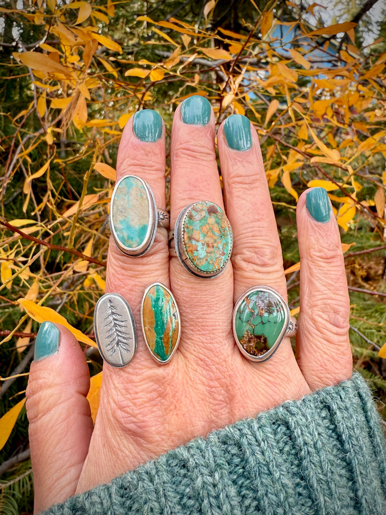 High grade green Royston turquoise stone sits atop a hand stamped sterling band.