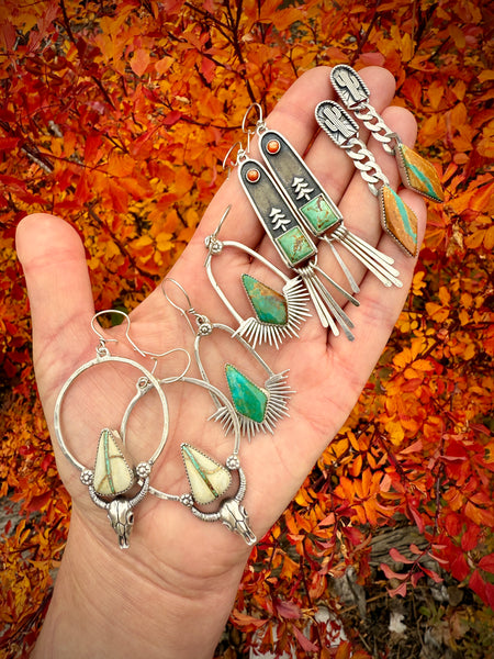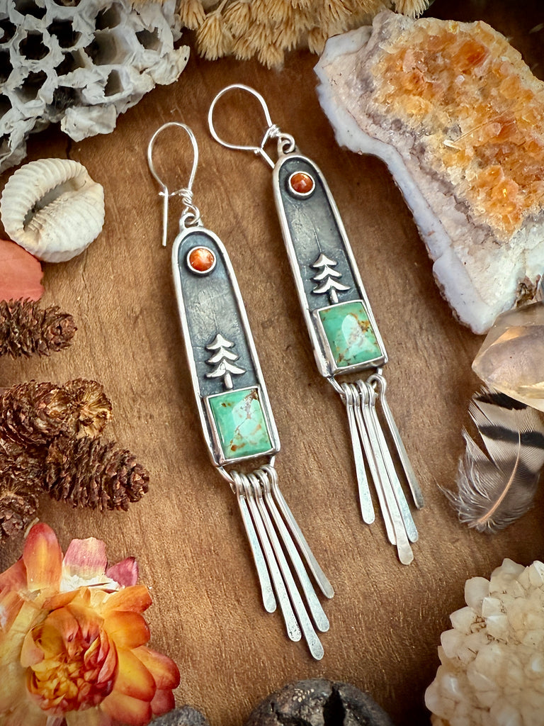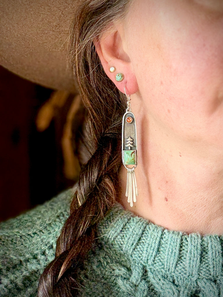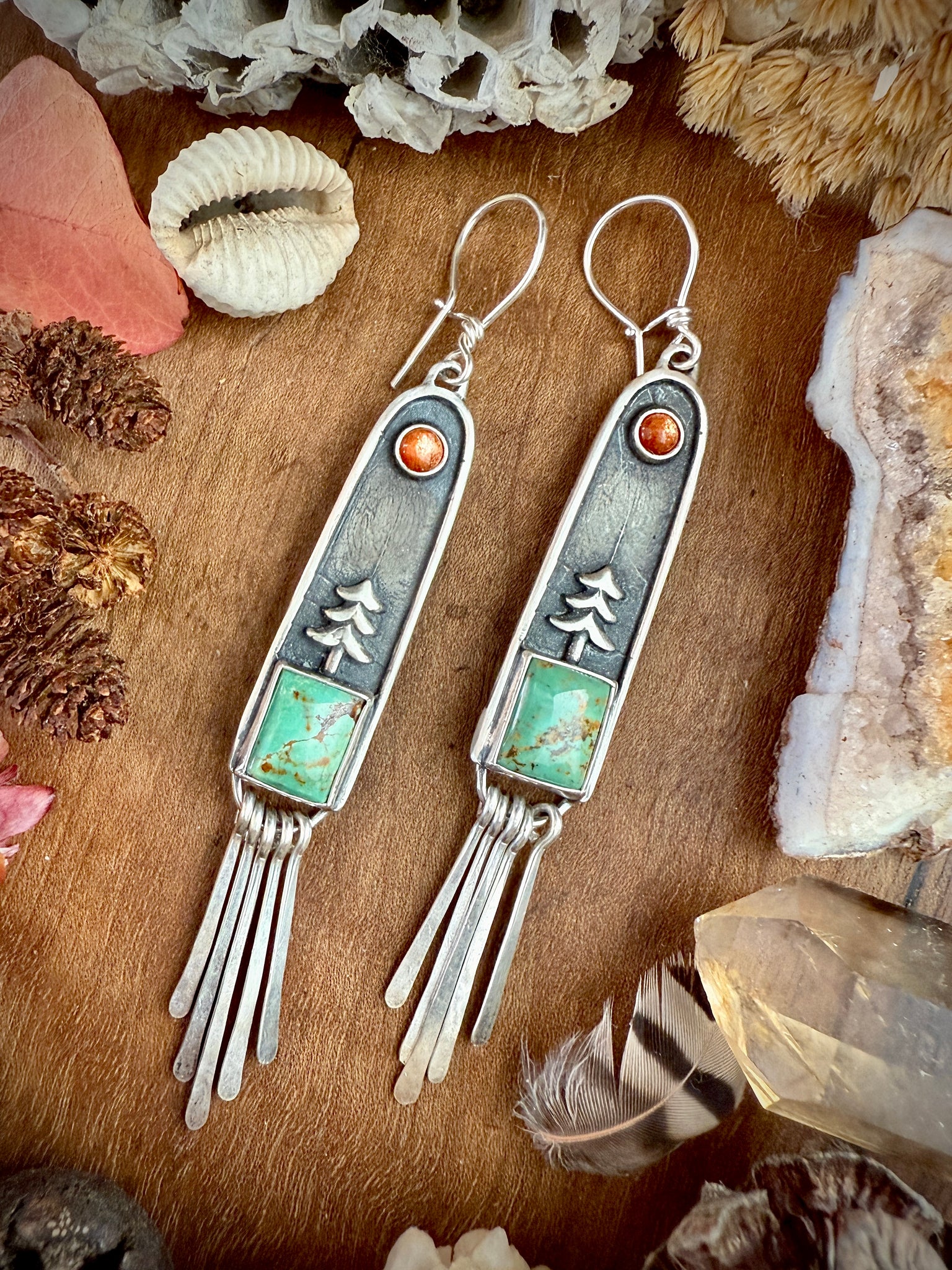 Sterling silver earrings featuring green Kingman turquoise, sunstone, pine trees and fringe.