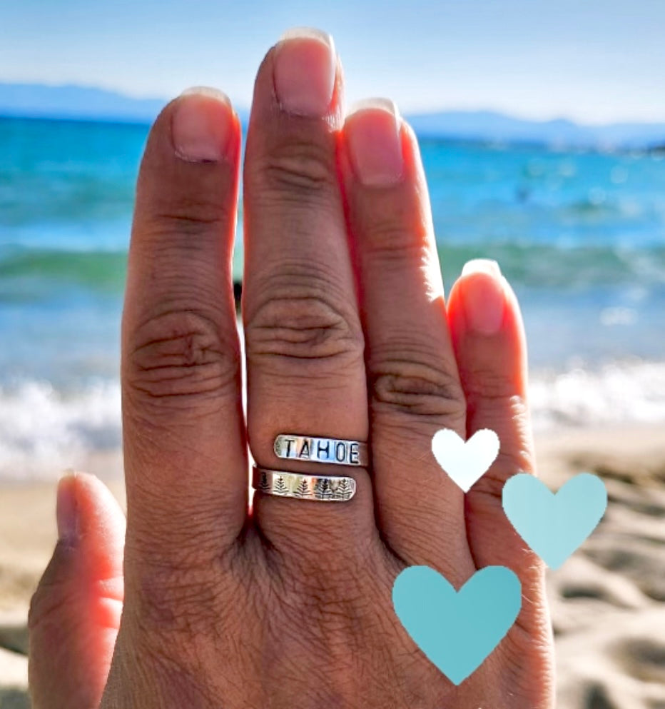 Sterling silver adjustable style ring with stamped “Tahoe” and trees.